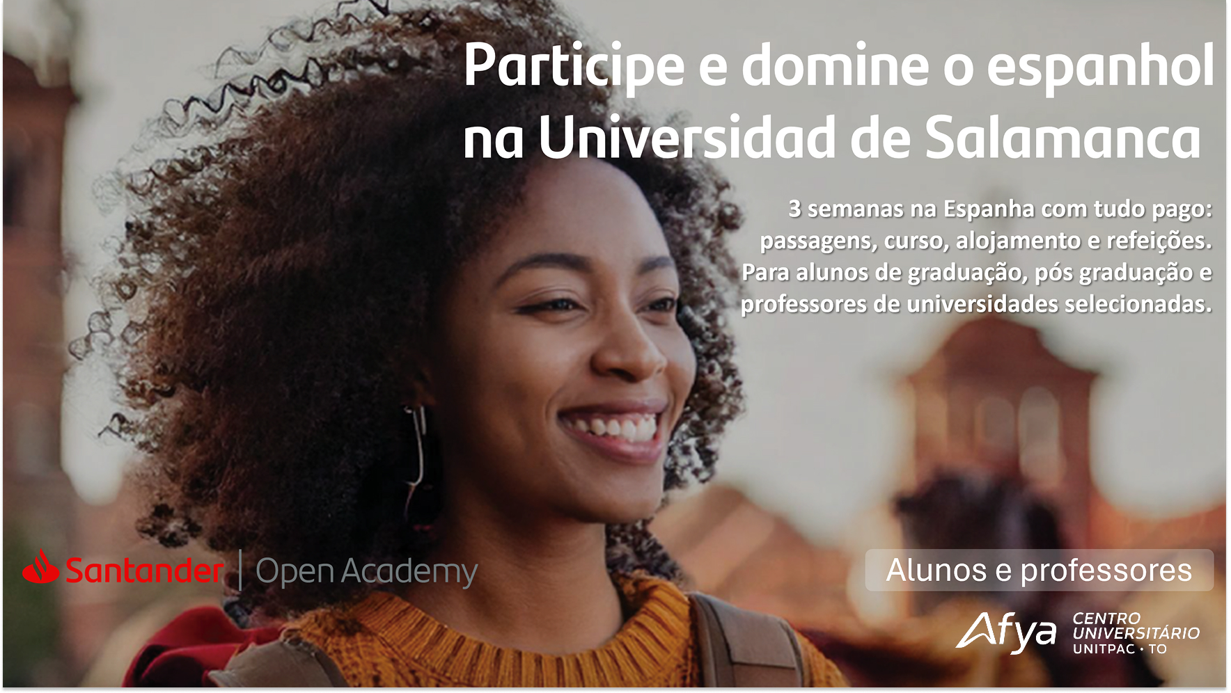 O Santander Top España 2026 oferece aos participantes uma vivência acadêmica internacional, promovendo o aprimoramento do idioma espanhol, o contato direto com a cultura espanhola e a ampliação da formação acadêmica e profissional.