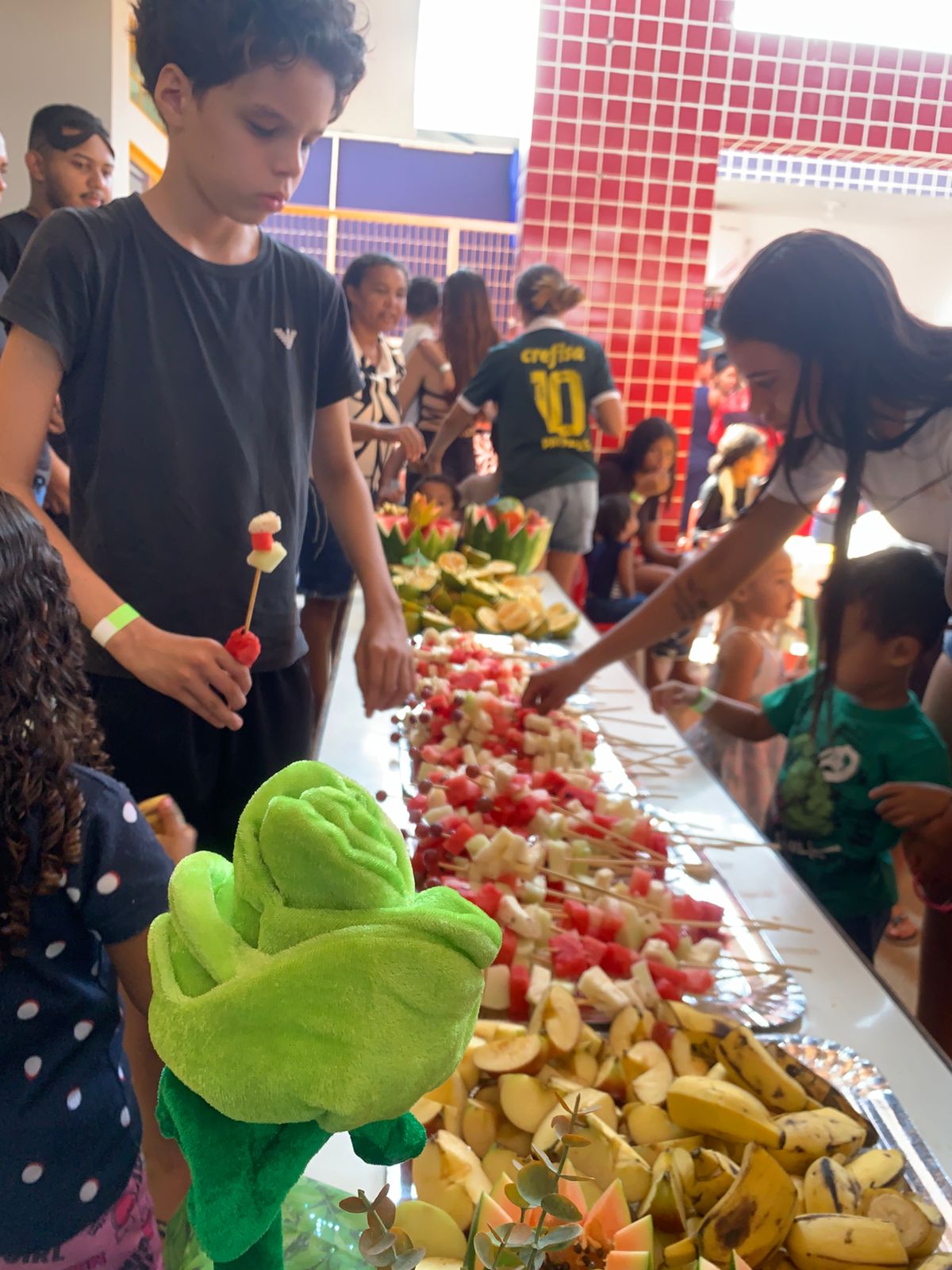 A programação incluiu uma peça teatral educativa sobre alimentação saudável, seguida de uma mesa de frutas colorida e nutritiva, cuidadosamente preparada para incentivar hábitos saudáveis.
